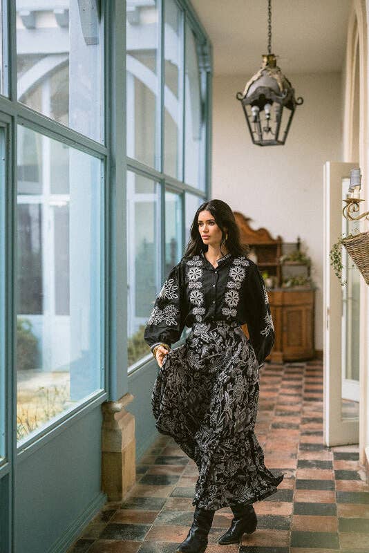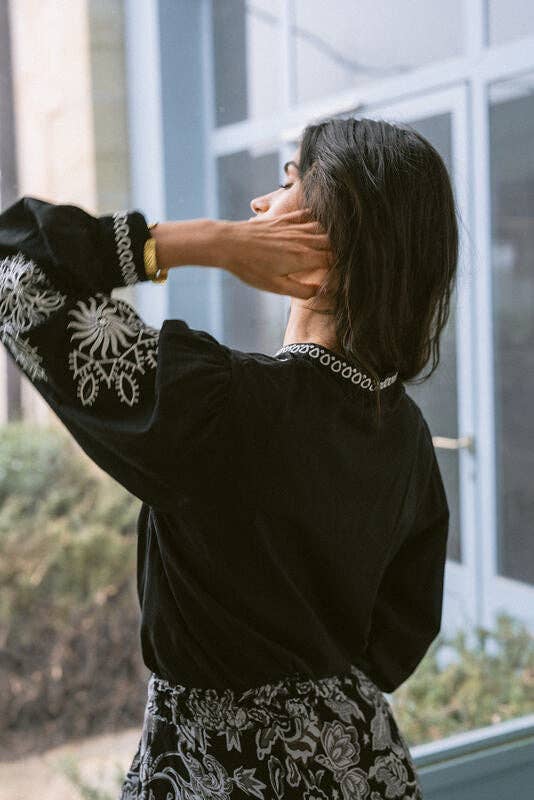 Ein Statement in Schwarz & Weiß: Die Bluse Verona von Piti Cuiti vereint feminine Raffinesse mit handwerklicher Kunst. Das schwarze Baumwollhemd begeistert durch aufwendige weiße Blumenstickereien, die wie feine Kunstwerke wirken.
